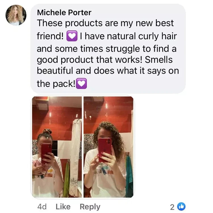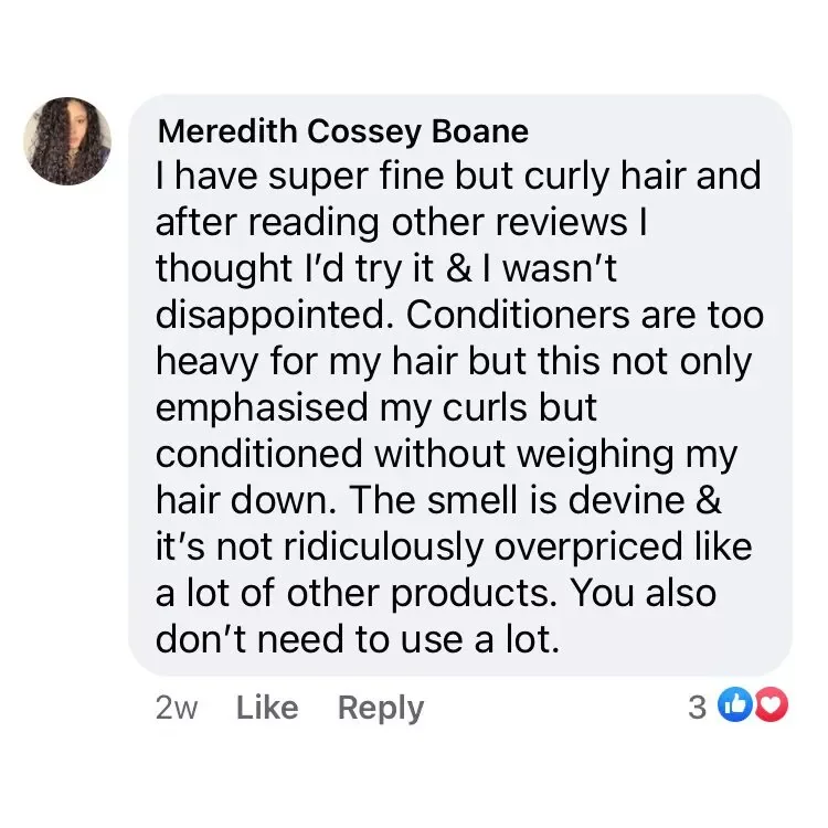 Love the smell of this line. Leaves curls feeling soft and hydrated. Great deal for the amount of products you get